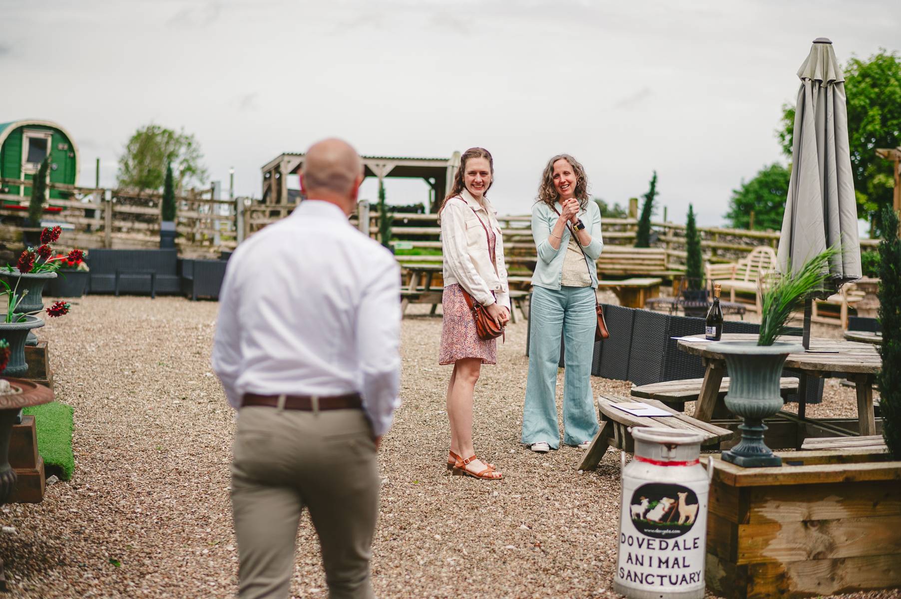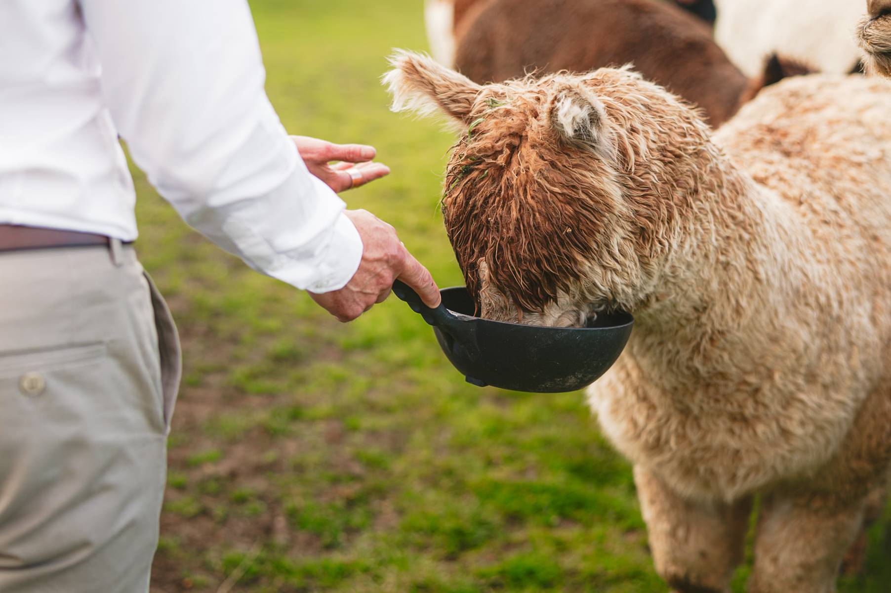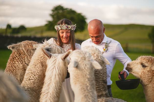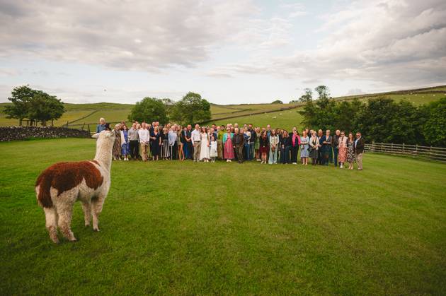 Lower Damgate Farm is also an animal sanctuary, so one of the highlights of hosting your wedding here is feeding the Alpacas. One of whom really wanted to be in the big group photo.